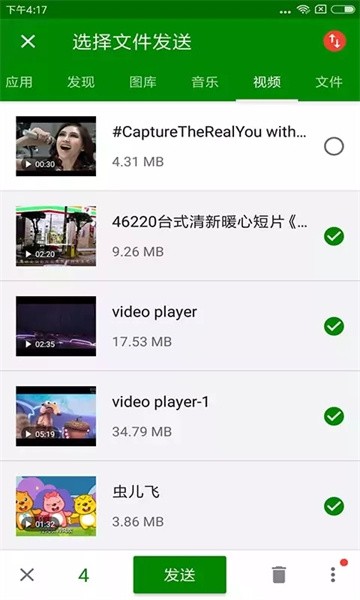 打开闪传后,从应用、图库、音乐、视频和文件中选择要传输的数据;选择好了,下面就会出现“发送”按钮,点击一下;