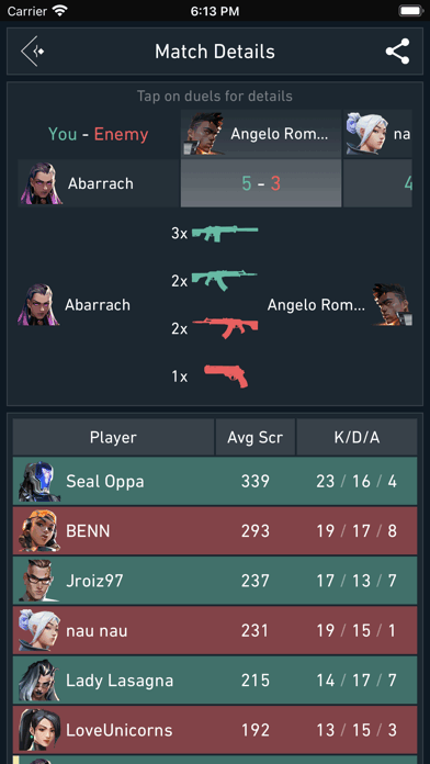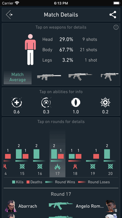 Spike Stats提供了球员完成的每一场比赛的详细信息。这包括地图信息、比赛期间累积的奖牌数量和名称、KDA信息及其细分(如每种武器类型的击杀)、回合详情、射击百分比和许多其他数据点。