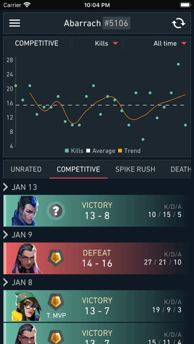 Spike Stats总结了球员最近比赛的进展。此摘要包括每个游戏模式的总胜率、每个地图的胜率、当用户作为进攻方或防守方开始比赛时的胜率,平均表现指标,如KDA和投篮百分比。