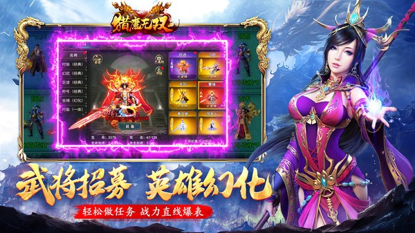 猎魔无双游戏是角色扮演类的热血传奇游戏,微变满攻速,全新极品传奇,特权顶配,实打实福利,广场自由交易,高倍回收,大量武将招募,轻松做任务,提升战力,还有酷炫时装装扮加持,十分拉风,可以集结帮众一起攻沙,称霸全区服!