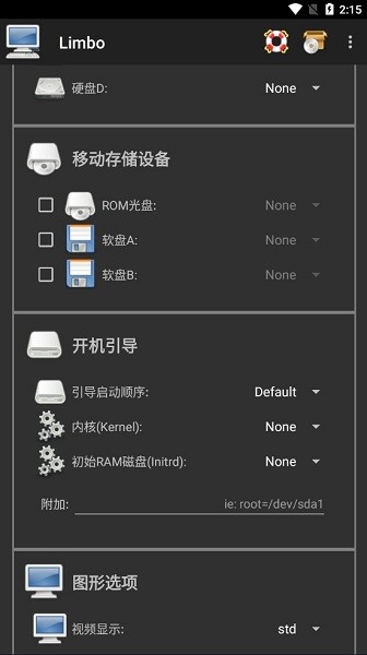 5、然后移动存储设备中的开机引导启动顺序,选择Hard Disk,也就是磁盘中你的镜像文件。可选rtl8139或者virtio。相比较来说virtio网卡全方面战胜rtl8139,但是可能出现无法访问网络的情况(非常少见)。所以这里可以自由选择。额外的QEMU参数这里所填写的内容(-smp 4,cores=4)中的俩个数字,要与前面的CPU核心选项里面的CPU核数保持一致,不然可能会造成卡顿或者导致limbo闪退、镜像蓝屏。额外的QEMU参数填写完以后,建议先回到顶部,虚拟机配右边那里选择None之后再改回来,这样可以让limbo保存配置文件,以防你填写额外的QEMU参数的内容消失。