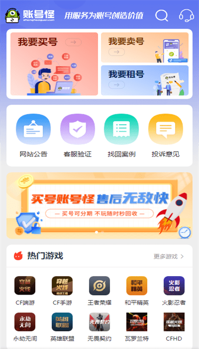 账号怪app作为面向广大玩家的游戏账号交易平台,集账号评估、账号回收交易、售后保障等功能为一体,覆盖大量热门的端游、手游,随你选择,安全认证,随时沟通交流,在线卖号买号,自由交易,轻松回收,客服贴心服务,高效便捷,保障交易安全!