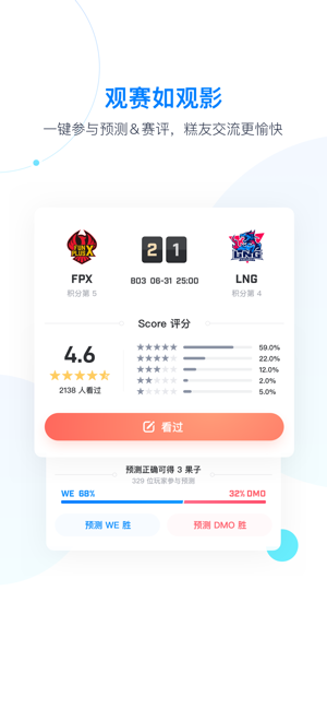 score最新版是一款提供电竞比赛资讯、数据分析的应用软件,适合电竞爱好者使用。覆盖所有电竞战队资讯信息,实时更新最新动态,官方知名赛事报道,热门赛事直播在线观看,数据分析预测尽在掌握,支持互动问答,在线发帖,更有业界大佬、职业选手答疑解惑!