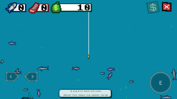 3、点击E开始钓鱼。钓鱼线会自动下降;使用左右方向键来控制它的方向。用鱼钩撞击一条鱼,对它造成伤害,伤害足够后将它钓上来。