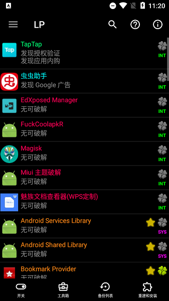 - 筛选应用列表:按授权验证、Google广告、自定义破解、虚拟机缓存修复、未发现破解、已修改