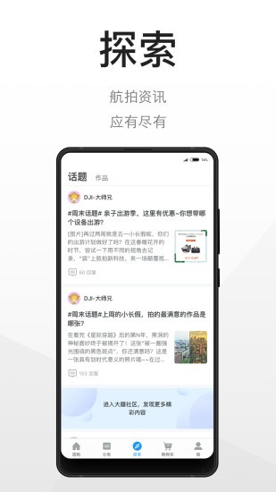 这个App是DJI大疆官方商城的应用程序,主要功能包括浏览和购买各种大疆系列无人机产品,查看详细的性能参数和使用手册,还能在线欣赏航拍效果图并下载。界面设计简洁明了,操作起来非常方便。用户可以参与各种优惠活动,第一时间获取新品信息,并且还能通过App查找附近的航拍地点,分享自己的飞行体验。