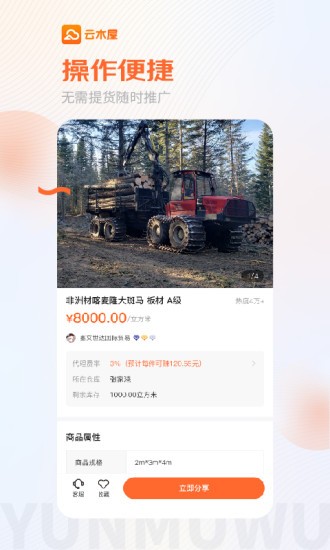 云木屋是基于解决传统木材行业供应链问题,而打造的一个优质、专业的木材代理推广平台。注册成为云木屋的用户,可获得优质商品的代理、推广权。