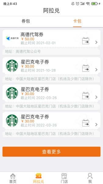 2.众多的门店可以使用电子券,电子券兑换全部显示;