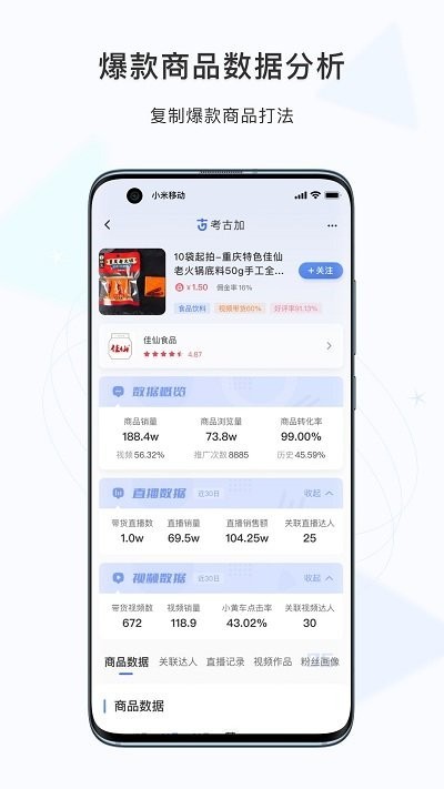 考古加官方版是提供数据分析的应用软件,专门针对电商平台带货行业。带来丰富的视频数据,还原直播间流量趋势,精选优质热门商品快速定位,复制爆款商品打法,支持全面、多维度分析商品数据,提升带货能力,实现流量与销量的双丰收!