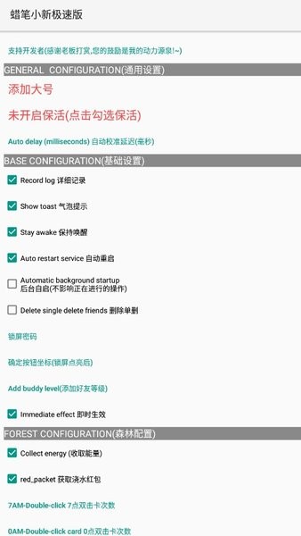 这款叫蜡笔小新极速版的app是一个自动收集支付宝蚂蚁森林能量和水滴的Xposed模块。对于每天都要手动登录收集的人来说确实是个神器,特别是对于像我这样懒得操作的人来说简直是救星。这个工具功能挺强大的,除了基本的自动收取外,还能设置锁屏密码、检测间隔,甚至可以实现小号和大号的操作分离。最新版本还增加了更多有趣的功能,比如自动赶鸡、打赏好友、登山赛改分等,看起来像是个全能助手。