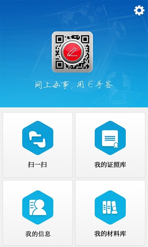 2、清晰简洁的主页功能内容,里面设置了扫一扫、我的证照库和、我的资料库和设置功能四个板块;