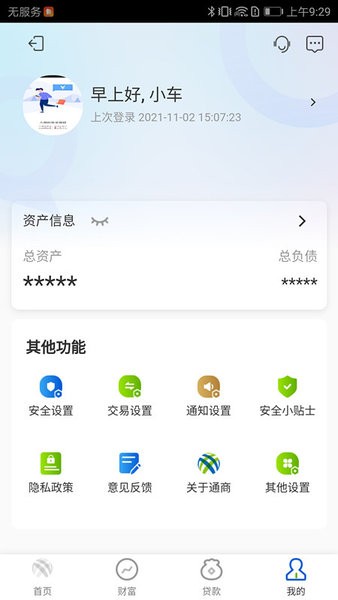 --丰富支持工具种类,优化客户体验,便捷客户操作。优化理财和贷款产品展示,用户关心的关键信息重点突出,查看产品一目了然。优化产品购买流程,减少不必要的页面跳转。新增交易设置和安全设置,注重个性化的设置和感受,增加用户互动环节,如意见反馈、安全小贴士、关于通商等。