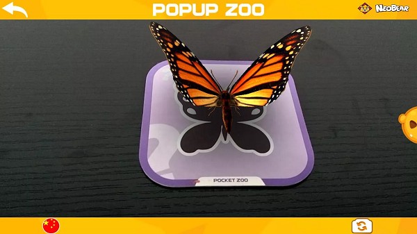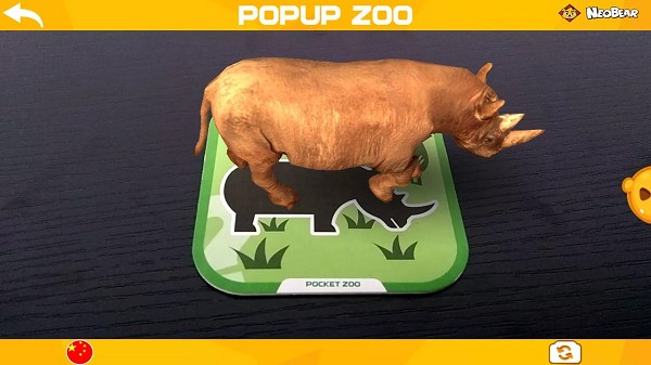 “口袋动物园”是一款基于AR(增强现实)技术的儿童启蒙教育产品,可以让立体的、活生生的动物出现在孩子的手心里,寓教于乐,让认知、识字变得更加有趣,带来了前所未有的学习体验。此应用通过AR及三维实时渲染等技术,将虚拟动画和实景空间融合起来,屏幕上的3D动物可以随着卡片做横向360度旋转和纵向90度翻转。