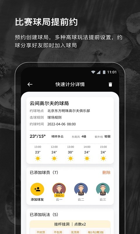 云间高尔夫手机版是一款专门提供高尔夫运动服务的应用软件,可以在线预约创建高尔夫球局,与球友保持紧密练习,组队比赛,还支持多人记分,实时同步,提供天气预报服务,让你畅玩高球,更有许多精彩内容等你发现,使用简单又方便!