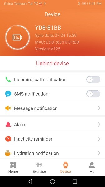 此界面可以查看绑定的设备信息,解绑设备。绑定设备后可以对来电提醒,短信提醒,消息提醒,闹钟提醒,久坐提醒,饮水提醒,吃药提醒,遥控自拍等进行设置;更多设置里可以寻找手机,恢复手表的出厂设置,打开手表省电模式,对手表固件更新,开启关闭自动心率测试,设置时间格式,步数接入微信运动。
