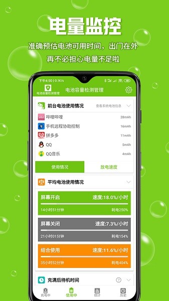 ・轻松的掌握手机电池的预估使用时长,这样就能让您不用担心手机电量不足