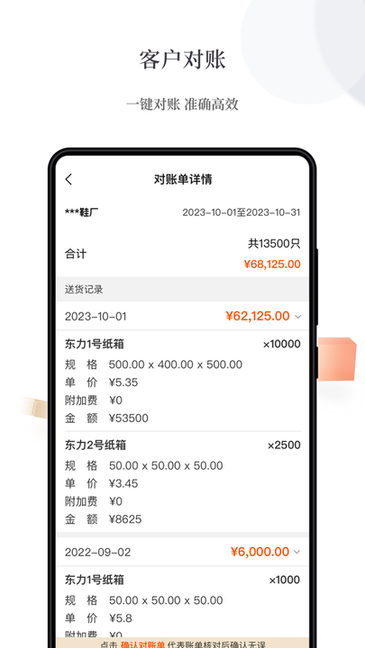 若客户接受电子对账,您只需一键“转发”电子对账单至客户微信。在线确认,账款清晰可见,节省了双方对账的宝贵时间。易纸箱APP让对账变得更加便捷。