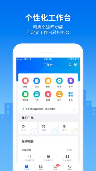 全流程移动化,自定义工作台。支持房源在线定价、预约带看、电子签约、线上支付等,轻松实现移动管房、管人、管账。
