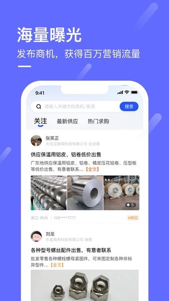 发布的供求信息、产品类型和采购订单进行精确推广,根据客户标签智能匹配优质客户,海量商机线上合作。