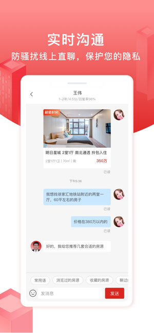 近万专业经纪人全天候待命,防骚扰线上直聊,保护您的隐私信息;