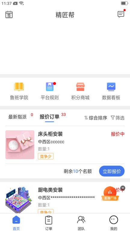 精匠帮师傅接单端软件是专为鲁班到家的企业服务商打造的订单管理app,师傅用户可以在手机上查看详细的订单,各种类型的订单数量非常清晰,能够在线参与培训和学习,还能查看详细的数据报表。