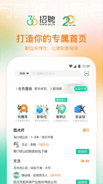 36招聘app是由深圳市万泉河科技股份有限公司旗下一款求职官方手机客户端软件,这里有丰富的职位推荐,平台信息真实,安全可靠;招聘、找工作就上36招聘,可线上与hr聊天,电子简历更方便,找工作更快,有需要的朋友不要错过哦!