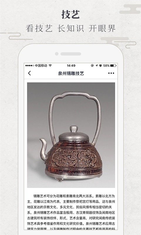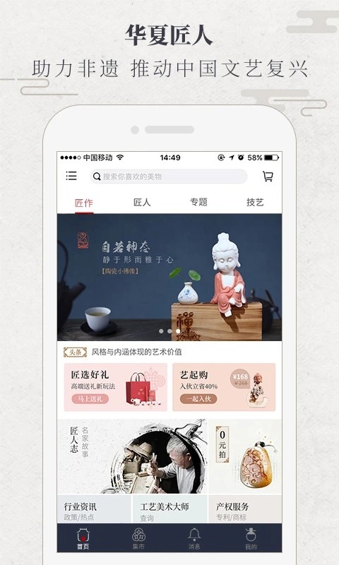 华夏匠人官方版是提供传统手工艺美术文化产品交易传播的应用平台,汇聚众多匠人工艺美术作品,双重审核,随你自由搜索查询,在线了解查看,欣赏其中魅力,开拓眼界,精选推荐,自由交易买卖,个性定制,助力非遗,推动中国文艺复兴!