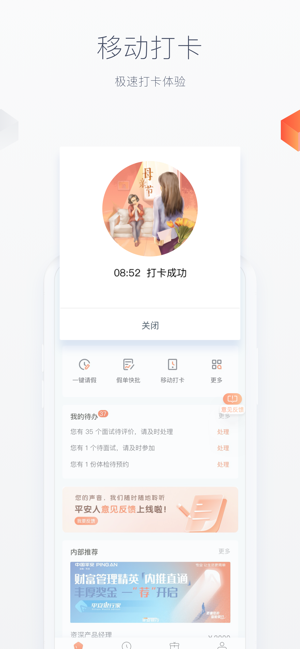 平安人最新版是一款平安保险公司旗下提供hr办公管理服务的应用平台,面向内部员工,支持移动打卡,还带来一站式人力资源功能,可以在线互动交流、分享,支持内部推荐人才和奖励机制,精准匹配,有效提高效率,让办公更加得心应手!