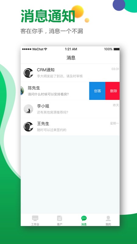支持客户、经纪人双方即时消息通讯、智能提醒,经纪人不再错过任何消息;