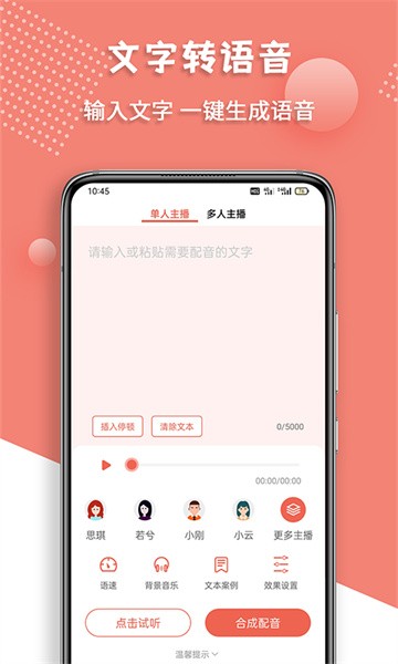 1,智能语音合成:粘贴或输入需要转换的文字,选择自己喜欢的主播,添加背景音乐,设置语速,一键合成语音配音,适用于地摊叫卖、广告促销、商场宣传活动合成配音