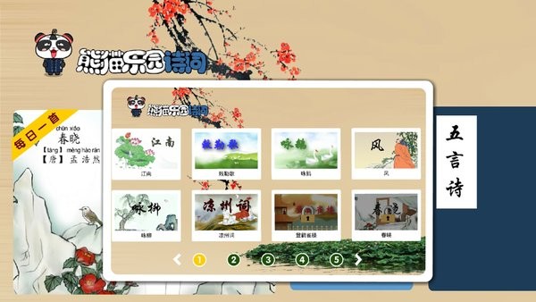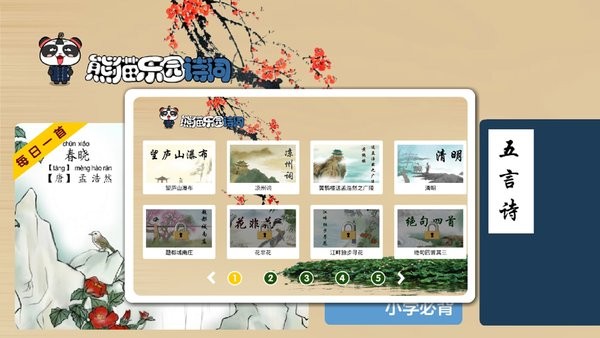 熊猫乐园诗词游戏app拥有小学阶段需要掌握的古诗词内容,包含了登鹳雀楼、登岳阳楼、望庐山瀑布等,有非常卡通形象的诗词配图,有详细的拼音注释,真人标准发音,可以查看详细的注释,便捷的进行古诗词的学习和背诵。