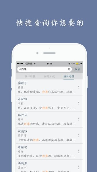 强大的本地搜索,如果有要查询的诗词,无论是根据作者、标题还是诗句,都可直接搜索查询,无需联网,只要你能想到的都能查到,做你的随身诗词大词典。