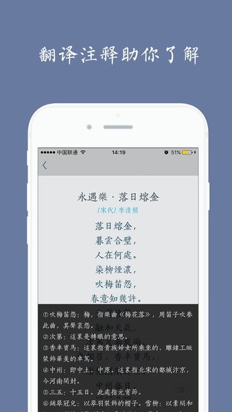 很多诗词都有对应的注解和译文,方便理解用词以及整首诗词的含义,就像回到了上学时候的诗词解析。