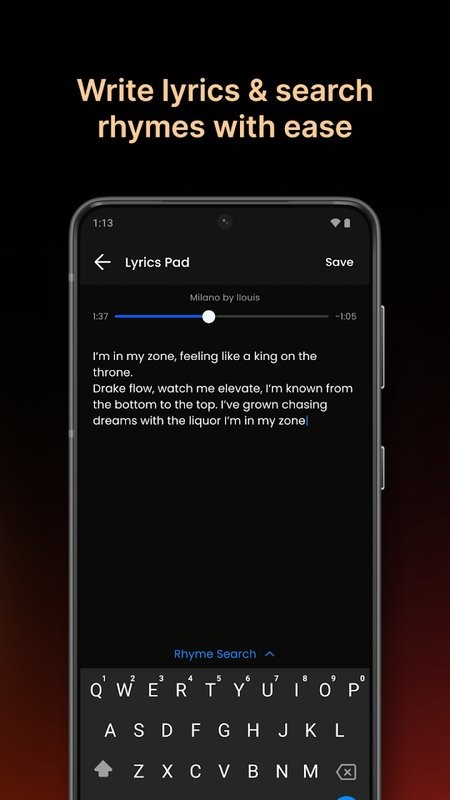 -- 您可以为喜爱的曲目创建无限播放列表,以便以后收听。写歌词并在歌词板中搜索押韵词。