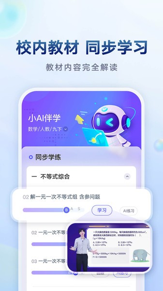 网易有道智学是网易有道旗下专注为学生提供个性化学练服务的智能教辅产品。通过自适应教学系统模拟真人老师教学思路,根据每一位同学的知识短板和拔高需求,生成专属学习路径,动态推荐高质量互动学习内容,包括专属学习规划、海量互动视频、海量自适应AI练习等。学生可以通过我们的产品与服务实现智能、高效、快乐的学习,快速提升学习效率和解题能力。