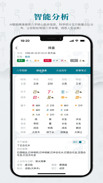 基于用户的干支排盘,提供文字、表单及图示等多种方式的全面的分析,涵盖传统学派中的多维度信息。
