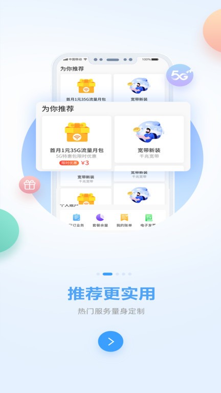 话费、流量、余额、账单等随时查,流量包、大流量套餐、宽带等一键办理。