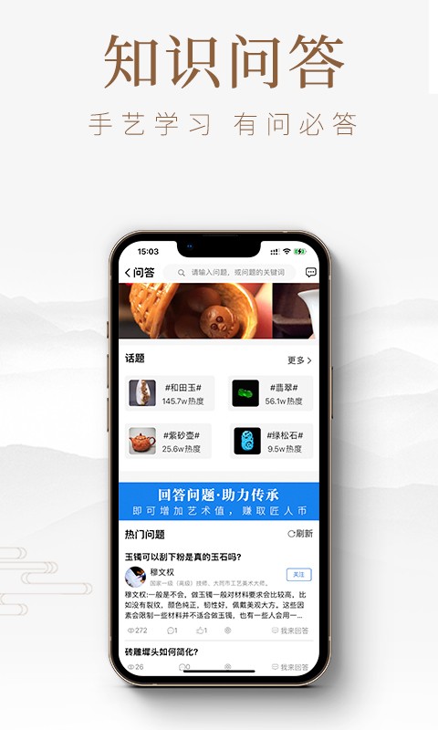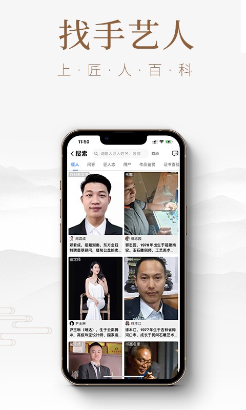 匠人百科app汇集了各行各样的匠人,能够查看他们详细的百科信息,这里有各种匠人相关的话题和知识问答,在商城里面可以购买各种匠人商品,提供了匠品的鉴定服务,不用担心买到假货。