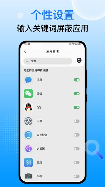 语音播报王是一款令人惊叹的语音助手软件,您可自定义选择播报应用消息(如qq、微信、电话、短信等等),根据自身需求设置关键词是否播报,这样既能实时知道信息内容,又可以保护好隐私。软件打开在后台挂起即可使用,帮你节省非常多的时间,让您不会错过任何重要信息。
