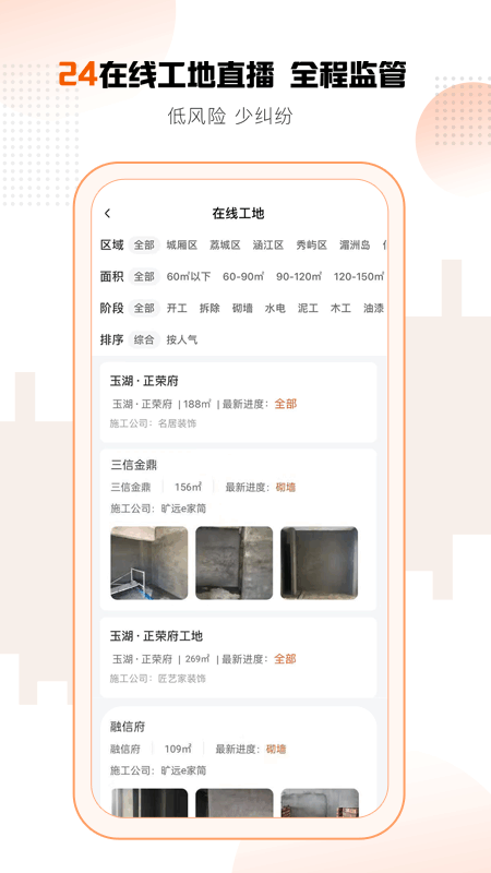 旷远e家由诚信入驻装企提供高品质施工服务,平台专业监理提供过程质量把控,在线工地全城在线直播!