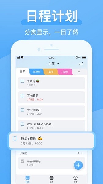 -分类事件:把我们的计划分门别类,用颜色区分开来,并且支持查看分类事项。学习科目分类、生活工作区别我们都能做到!