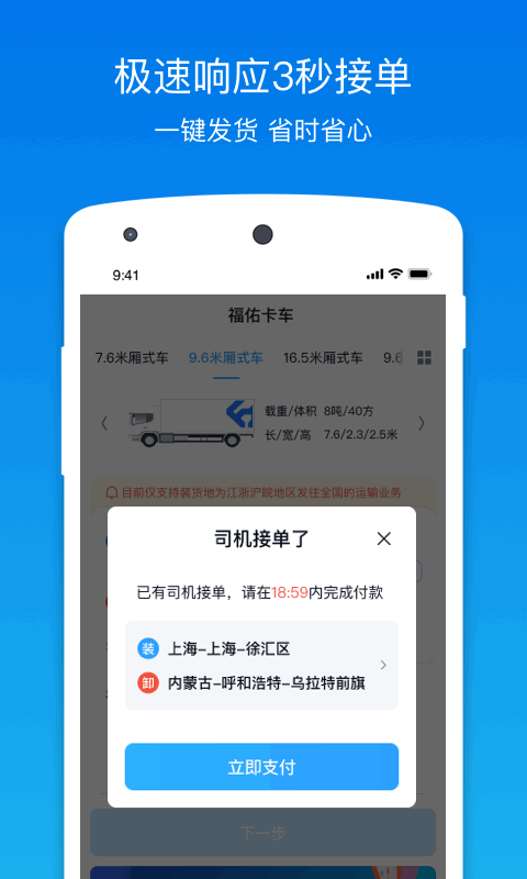 发7.6米以上厢车,就用福佑卡车货主版App。福佑卡车帮助货主企业快速找车发货,为货主提供靠谱省心的整车运输服务。有运输需求的货主可在App上快速发货、查看运输轨迹、进行费用结算,平台不收取任何信息费,提供货损保障,并有专属客服7*24小时全程服务。
