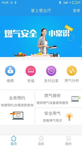 燃气营业厅是一款提供燃气账单查询和缴费、预付费燃气表充值、燃气用户各类业务预约(包括报装申请、更换燃气软管、燃气设备安全隐患检查等)和故障报修(包括燃气管道故障、阀门故障、点火故障等)等功能的移动端应用软件产品。这款应用能及时通知用户按时缴费,下发燃气安全用气的提醒和通知,方便用户业务预约,提升燃气公司的服务质量。燃气用户可以通过本应用上传用气量、实时查看燃气用量和待缴账单,查看历史用气量、阶梯周期累计用气量等,让用户用气“心中有数。