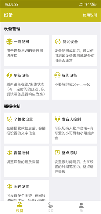 该应用主要用于控制设备播放收款信息、闹钟、整点提醒等,并且支持LED灯显示收款信息、自定义广告文字、天气数据的功能,还可以切换发音人哦。