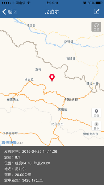 4、用户可通过地图查看震中的详细行政信息,以及震中附近的县城、医院和学校等的分布情况;