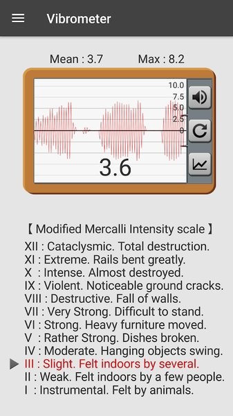 测量值与修正 Mercalli 强度量表 (MMI) 相关。如果不准确,您可以对其进行校准,使最大值约为 10-11。