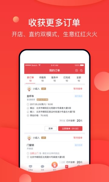 在不同城市不同品类提供“开店”、“直约”两种模式的经营方式。网上开店,客户自主下单;加入直约,平台智能派单。