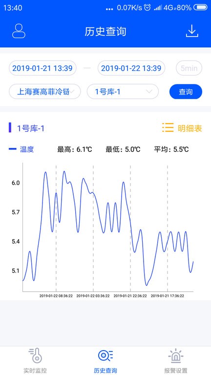历史查询:捷依冷库app历史查询界面可以查看到各个节点的历史数据。
