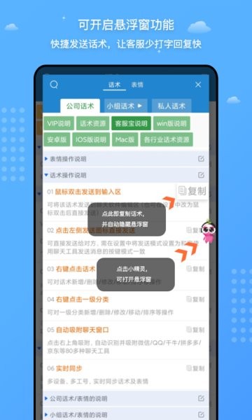 客服宝手机版是一款专为公司和企业客服设计的高效回复工具,能够快速解决重复性问题,提升对话质量。它支持多人共享话术,电脑版和手机版实时同步,极大提高了客服的工作效率和服务质量。软件功能丰富,包括悬浮窗发送、表情分享、批量操作、快速排序等,还支持多种语言存储。我个人觉得这款工具真的很有用,尤其是对那些需要频繁回复相同问题的客服来说,可以节省大量时间,减少疲劳感。如果你正在寻找一款提升客服效率的神器,客服宝手机版绝对值得试试!
