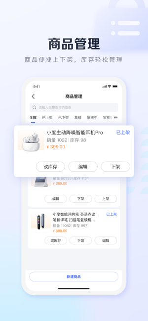 基木鱼开店最新版是专为电商平台商家打造的开店经营管理app,轻松入驻开店,管理商品上下架,库存状态一手掌握,发货订单及时处理,还可以在线统计营业数据,了解详情,售后问题快速响应,消除隐患,助力经营管理,营销决策!